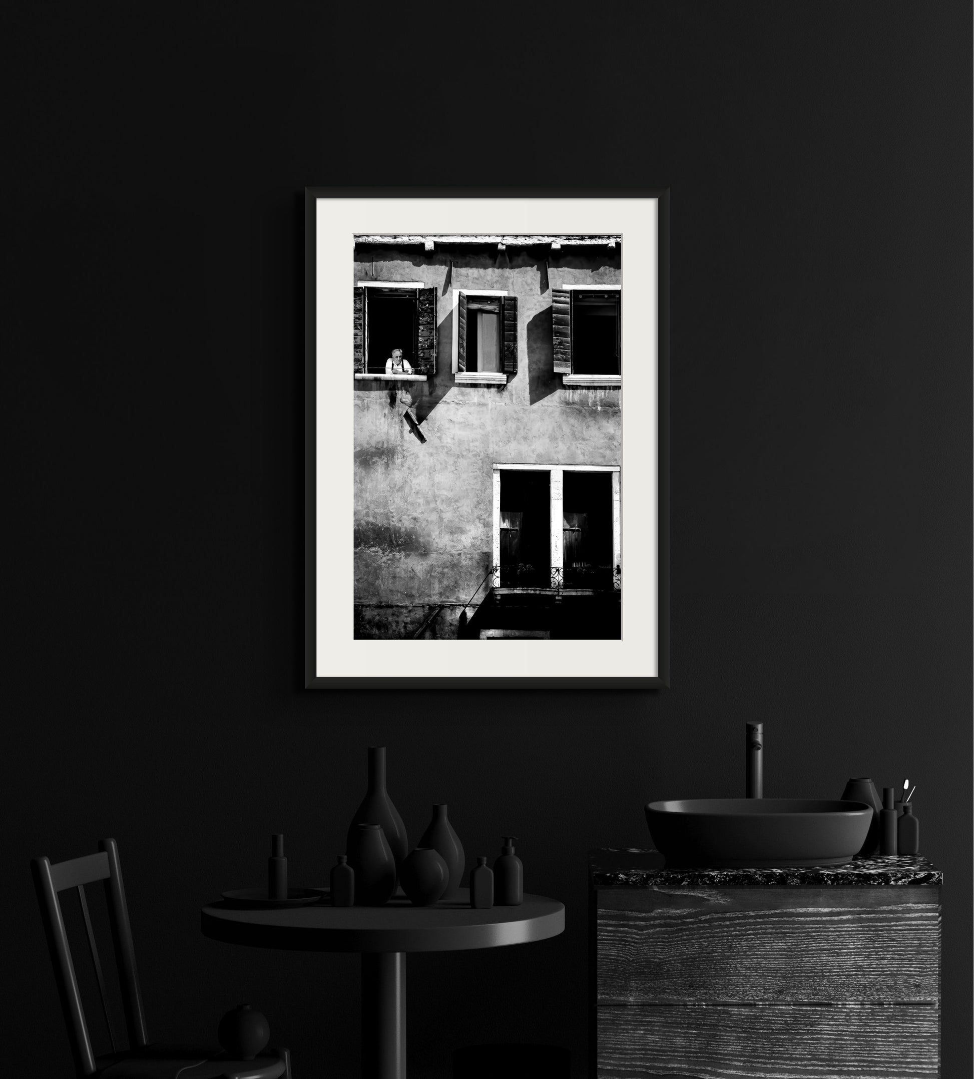 9" x 14" Print with 3" Single Mat framed in Gallery Black. 16 3⁄16 x 20 7⁄8" final frame dimensions.